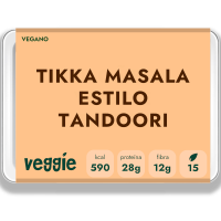 Arroz de grano corto (28%), crujiente vegetal de soja (18%) [proteína de soja, proteína de trigo, proteína de haba, cebolla seca, harina de trigo, almidón de maíz, fibra de guisante, aceite de girasol, sal], salsa katsu ligera (38%) [cebolla, manzana, jengibre, ajo, zanahoria, porcini seco, kombu, aceite de colza (reducido), concentrado de tomate, miso blanco [soja, arroz, sal], salsa de soja [soja, trigo, sal], levadura nutricional fortificada con vitamina B12, cilantro, comino, fenogreco, mostaza en polvo, hinojo, guindilla, canela, pimienta negra, cardamomo, laurel, clavo, crema de coco (reducida)], ensalada japonesa encurtida [zanahoria, cebolla, vinagre de arroz, vinagre de vino blanco]