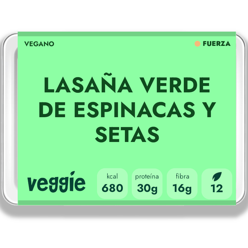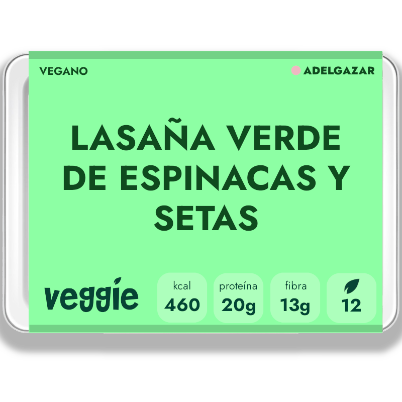 Tomate troceado (22%), cebolla, zanahoria, ajo, concentrado de tomate, champiñones (14%), espinacas (14%), pasta de lasaña (10%) [sémola de trigo duro], bechamel vegetal [puré de almendra, levadura nutricional, harina de trigo, zumo de limón], aceite de colza, proteína vegetal añadida (guisante), hierbas y especias