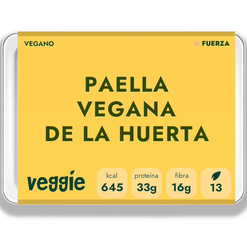 Arroz redondo estilo paella (28%), piezas vegetales de soja (11%) [soja], tomate triturado, cebolla, ajo, pimiento rojo, judía verde (10%), alcachofa (8%), garrofón (7%), guisantes (7%), judión blanco (6%), levadura nutricional fortificada con vitamina B12, zanahoria, aceite de oliva virgen extra (reducido), zumo de limón, caldo vegetal, azafrán, pimentón ahumado, romero, perejil, pimienta negra, sal